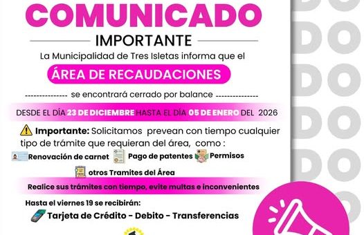 La Municipalidad de Tres Isletas informa a toda la comunidad que, debido a la realización del balance anual, el área...
