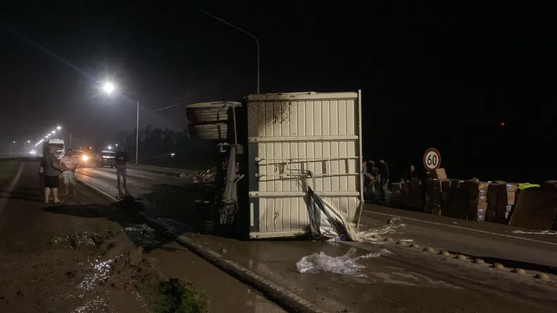 Un camión de transporte que llevaba un cargamento de postres lácteos volcó en la ruta nacional 16 cerca de Quitilipi durante la madrugada de este viernes, en un incidente que afortunadamente no dejó heridos pero sí importantes daños materiales.