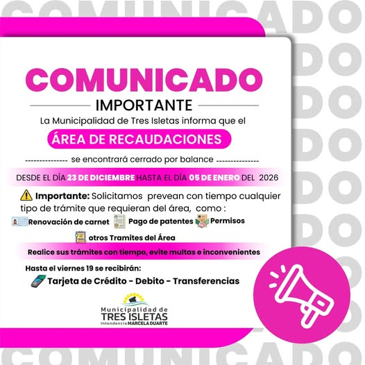 La Municipalidad de Tres Isletas informa a toda la comunidad que, debido a la realización del balance anual, el área de Recaudaciones permanecerá cerrada al público durante las fiestas y el inicio del año nuevo.