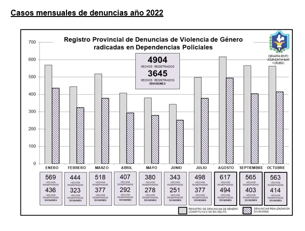 Según los datos publicados por la Policía del Chaco, los hechos registrados son 4904 y los registrados en divisiones son 3645. El mes con menor cantidad de denuncias fue mayo con 380, mientras que agosto registró el máximo de 617.
