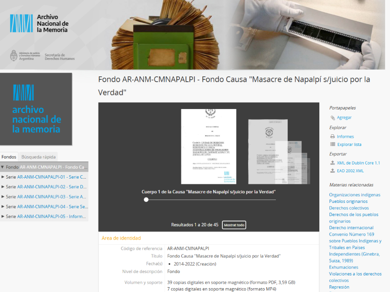 La puesta a la consulta pública del fondo Causa «Masacre de Napalpí S/Juicio por la Verdad» permite a todos aquellos que tengan interés poder acceder y descargar de manera libre todos y cada uno de los testimonios, documentos y trabajos de investigación que fueron partes esenciales de la investigación preliminar y el juicio en sí mismo. «Cualquier persona, desde cualquier lugar del mundo, puede entrar al catálogo y leer los testimonios de los sobrevivientes. Eso es reparación», señaló el referente.