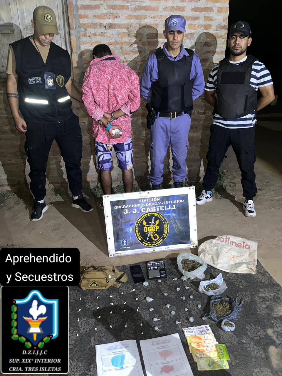 Personal de la División Operaciones Drogas Interior de Juan José Castelli realizó el pesaje y pruebas de campo, las cuales arrojaron resultado positivo para cocaína y marihuana. La Fiscal María Eugenia Arechavala Viola, de la Fiscalía Antidrogas N° 2 de Resistencia, dispuso el secuestro de los elementos mencionados y la notificación de la aprehensión de V. A. S. por presunta infracción a la Ley Nacional N° 23.737 de Estupefacientes, en concordancia con la Ley Provincial N° 2304-N de Narcomenudeo. El imputado permanece alojado en la dependencia policial.